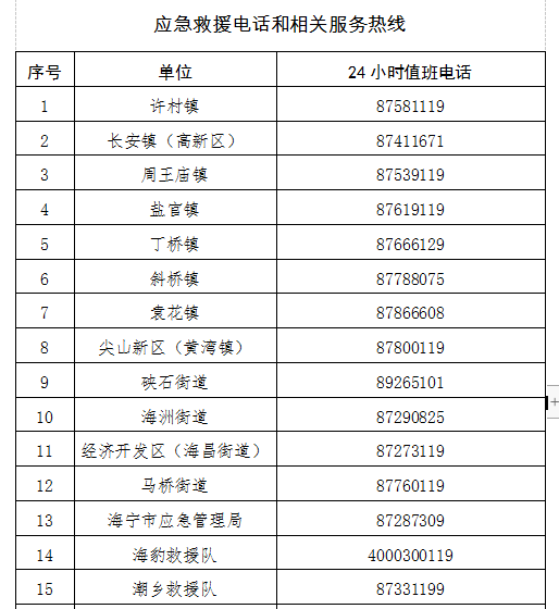 广大市民朋友们:根据气象部门预测,今年第6号台风“烟花”可能于25日下午至夜间在舟山到三门湾一带沿海登陆。台风“烟花”强度强、范围大、水汽充沛,登陆时适逢天文大潮期,极有可能出现“风、暴、潮”三碰头,且登陆后可能长时间滞留,狂风骤雨有可能造成较大范围、较大规模的损失。为此,我市已于24日13时启动防台风Ⅰ级响应,市防汛防台抗旱指挥部特此发出通告,呼吁广大市民朋友绝不能掉以轻心,一定要充分做好防风、防汛、防次生灾害的心理准备和物资准备,全力以赴共同做好今年第6号台风“烟花”防御工作。请广大市民朋友用实际行动彰显潮城品格、体现海宁精神,努力做到:1.关注台风动态。要通过官方发布、电视、广播和微信短信等各种渠道,及时关注台情、雨情、水情信息,尤其是大风、强降雨或暴雨预警信息。不造谣、不信谣、不传谣、不侥幸、不麻痹,提前储备饮用水、食品、手电等生活必需品。2.远离危险地段。远离海塘夹塘、江边池塘边、险工险段、建筑工地、涉水设施、低洼易涝等区域;注意道路、桥涵、立交桥等通行情况,远离商户牌匾、路灯杆、广告牌、井盖、围墙、挡墙、危化品、行道树木、充电桩等涉电设施,保障自身安全。3.减少外出活动。在全市城际铁路、城乡公交停运、部分道路封路、景区全部关闭的应急情况下,非特殊情况尽量不外出,如驾车外出注意避开积水路段,减速慢行,不要将车辆停放在地势低洼处,以免遭受损失。4.及时配合转移。建筑工地、临时工棚、危旧房、低洼易涝区、夹塘内的人员和其他重点危险区域人员,请自觉配合当地党委政府以及村委会(居委会)等各级组织的统一安排,及时转移到安全场所。已转移群众不要擅自返回家中,以免遭遇险情和其他意外。5.积极参与防御。管护好自家楼院、阳台、护栏、空调、太阳能热水器等设施,把搁置物、悬挂物、花盆等及时移入室内,避免高空坠物伤人。主动支持协助抢险救灾、排涝清淤、水电通信管线抢修等应急行动,及时上报风险隐患,体现文明素质。广大市民朋友,市委、市政府正在作“最全面”准备、强“最有力”举措、落“最严实”责任,全力做好第6号台风“烟花”的防范备战工作。让我们一起携手、共克时艰,保护美好幸福家园。如您需要帮助,请您拨打以下24小时应急救援电话和相关服务热线: